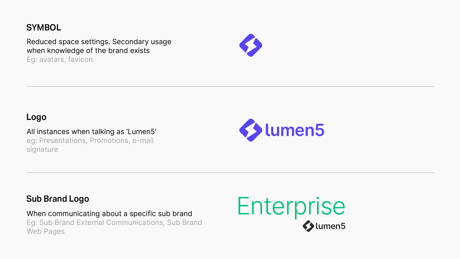 The Lumen5 brand encompasses a wide range of products and services. To ensure clarity and focus for our customers, we've established a tiered brand architecture. This structure differentiates between Lumen5 Master Brand, sub-brands, program brands and co-branding.