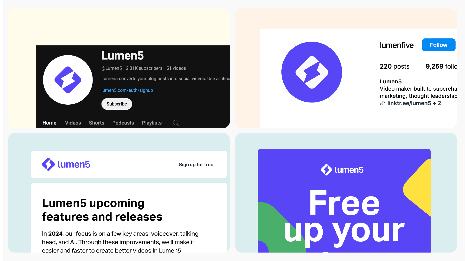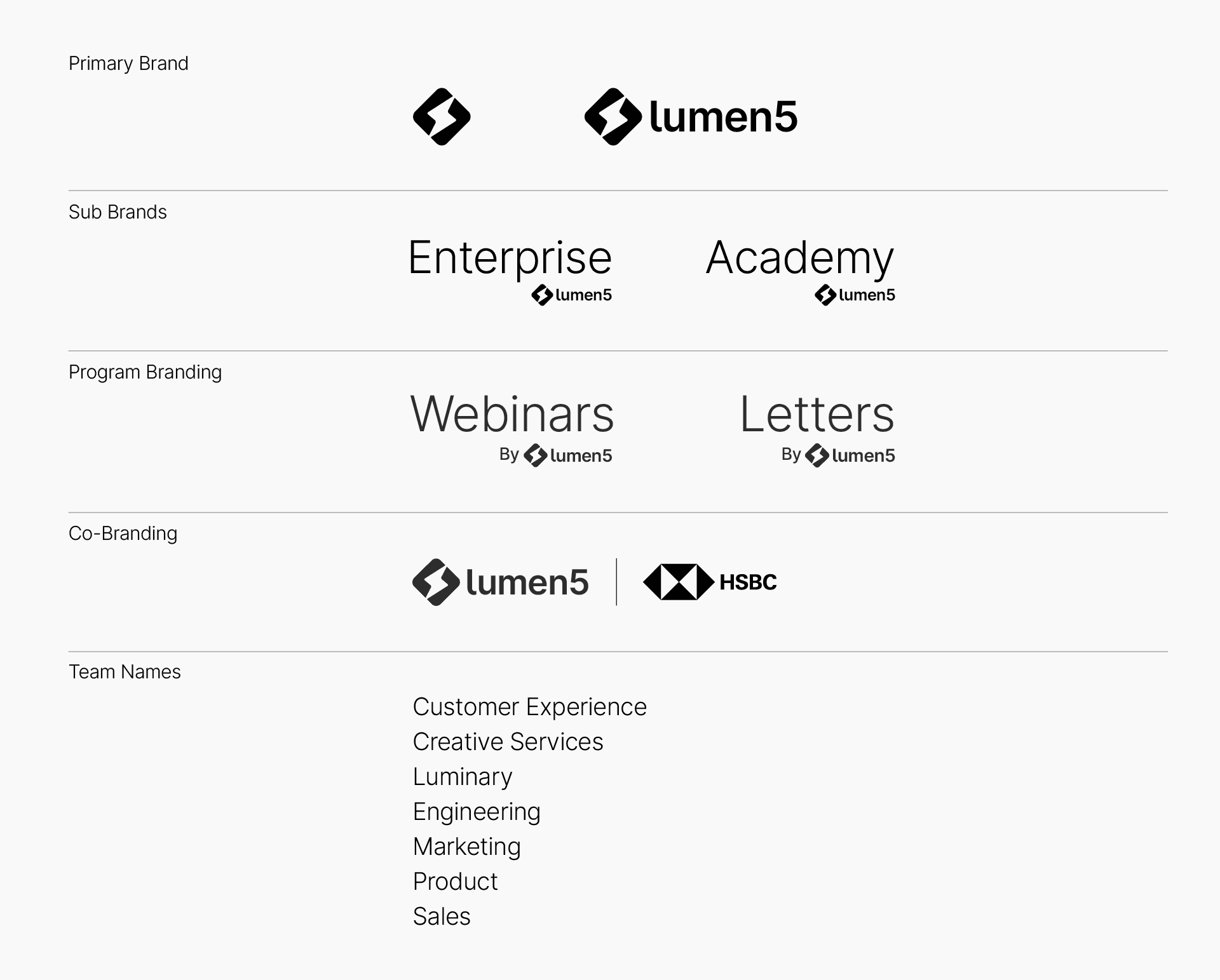 The Lumen5 brand encompasses a wide range of products and services. To ensure clarity and focus for our customers, we've established a tiered brand architecture. This structure differentiates between Lumen5 Master Brand, sub-brands, program brands and co-branding.
